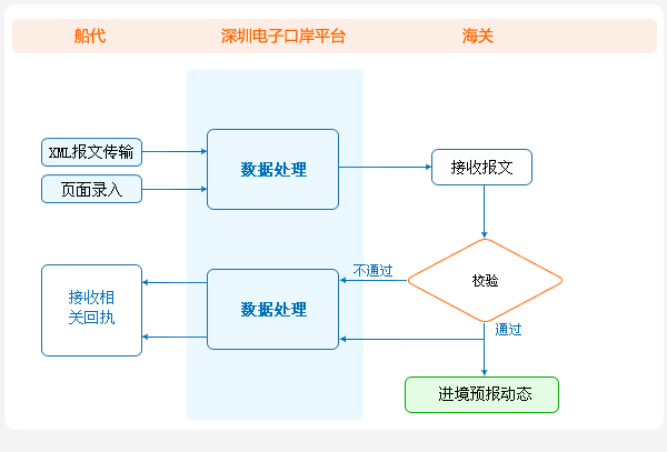 深圳电子口岸平台提供报文导入、前台录入及数据传输等功能,根据海关对数据的要求,对必填项等做控制或提示,将企业船舶动态数据发送海关,并接收相关回执。