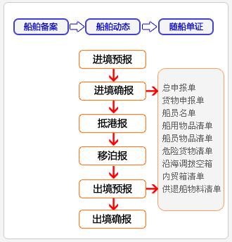 进境单据(总申报单、货物申报单、船用物品申报单、船员名单、船员物品申报单、国际海事组织危险货物舱单)要在进境确报动态确认后申报;出境单据要在离境预报动态申报后申报。沿海和沿江内支线船舶单据只报总申报单、货物申报单、危险货物申报单。