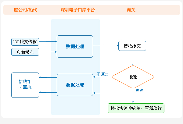 深圳电子口岸平台为企业提供XML报文传输及页面录入功能。并将海关的相关回执和指令传达给申报企业或码头。